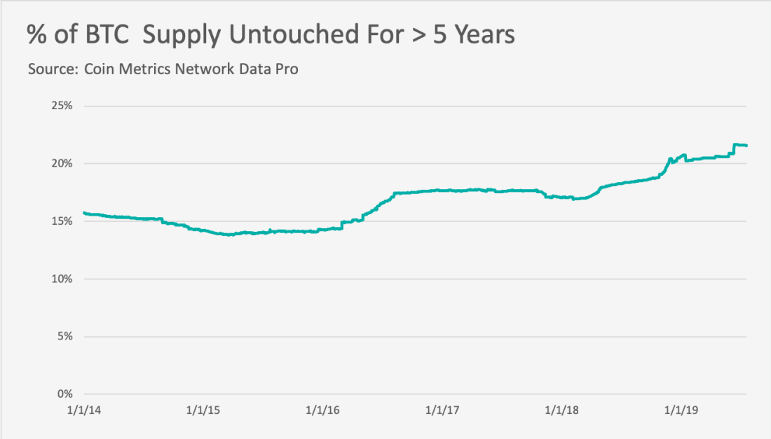 Selon Coinmetrics 3,8 millions de bitcoins n’auraient pas changé d’adresse depuis au moins cinq ans, ce qui représente près de 21,6% des 17,8 millions de bitcoins actuellement en circulation. Bien que la quantité de bitcoin ait constamment augmenté, le pourcentage de l’offre globale de BTC qui n’a bougé depuis au moins cinq ans est passée de 15% en 2016 à plus de 21% en 2019.