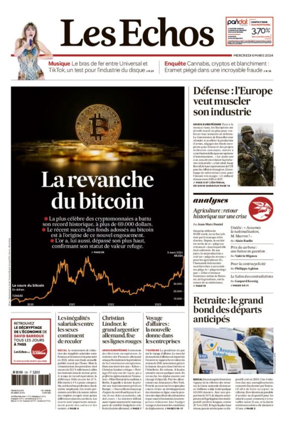 Le bitcoin a battu aujourd’hui son précédent record en dollars (68 950 $, le 10 novembre 2021), dépassant très brièvement les 69 200 $ avant de retomber sous les 62 000 $ dans une cascade de liquidations de positions longues (892 millions en une journée).