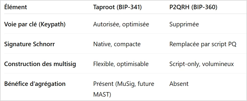 En désactivant définitivement la voie par clé (key-spend), en forçant l’usage de scripts explicites, le BIP-360 affaiblit les logiques d’optimisation et de confidentialité introduites par Taproot : dépenses compactes, multisig simples, signatures agrégées.