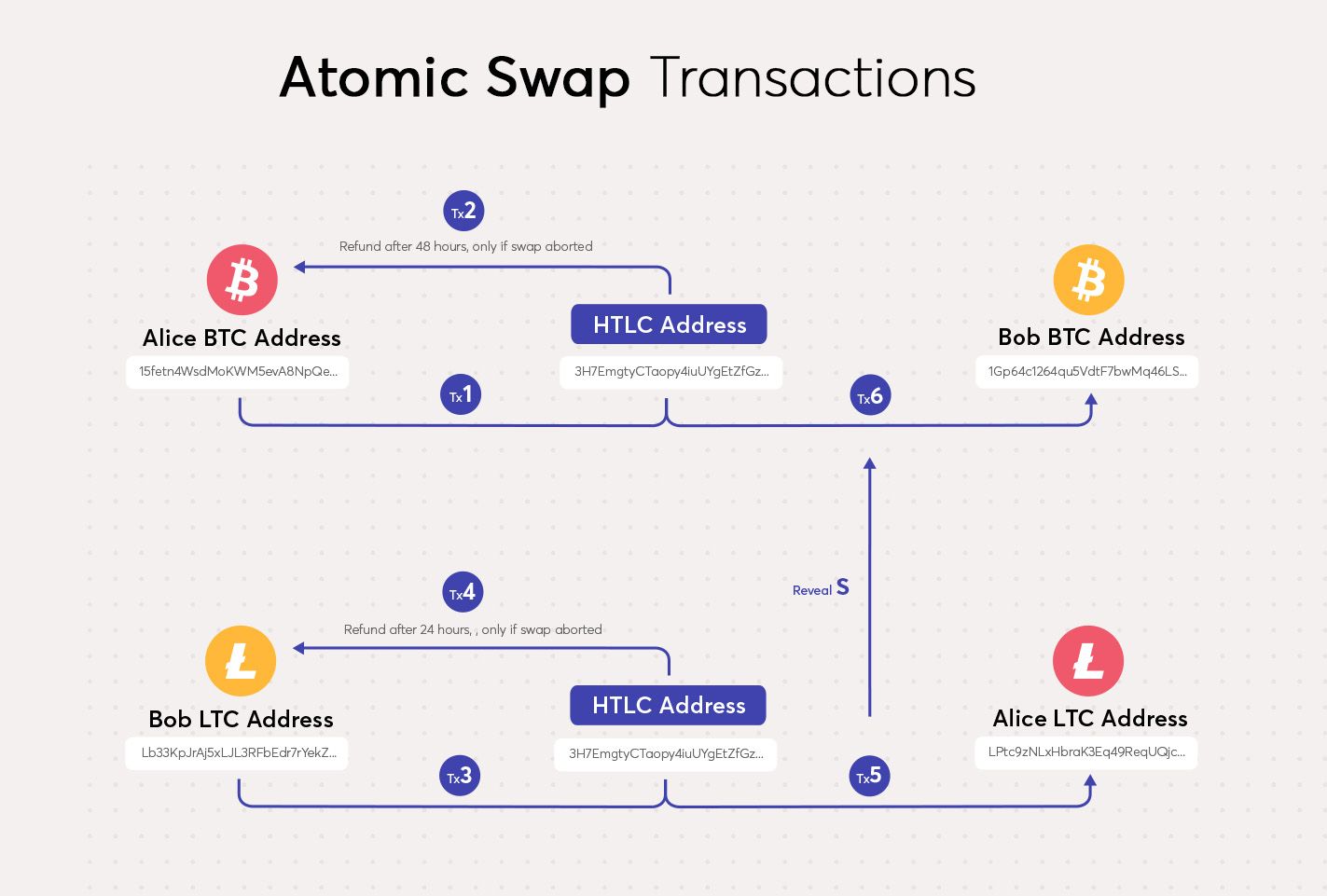 Dans notre exemple, Alice achète des litecoins à Bob avec des bitcoins. Le qualificatif « atomique », d’étymologie grecque, signifie simplement « insécable » (dans sa version latine), c’est-à-dire que les deux branches de la transaction, l’achat et la vente, ne peuvent être découpées : soit elles se produisent toutes les deux (le swap est effectué), soit aucune des deux ne se produit. Si le swap est stoppé par l’un ou l’autre des participants, chacun récupère sa mise.