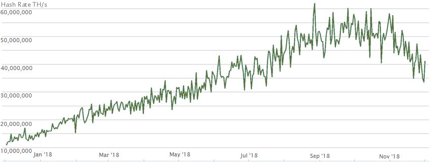 Le hashrate est monté en flèche jusqu’au 1er novembre, son pic historique, 60 M de TH/s. Mais Aujourd’hui, c’est 38 millions de terahash/s qui sont visibles, soit 22 millions de moins, et contrairement à ce que l’on aurait pu imaginer, cette puissance perdue ne se retrouve pas (ou si peu) sur les réseaux BCH. Cela équivaudrait à 1,83 millions de machines mises à l’arrêt en 19 jours, en estimant que chaque machine fait 12TH/s. Une hécatombe !