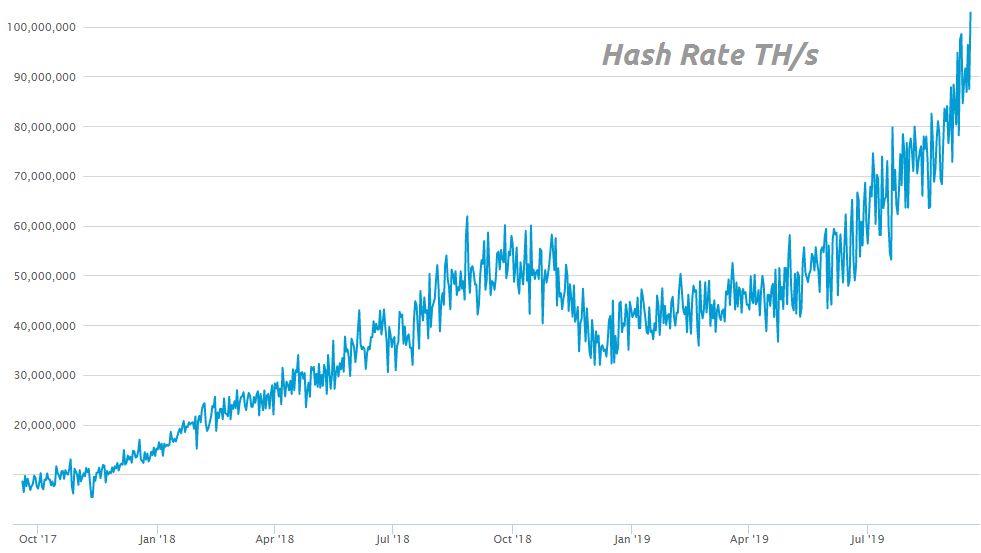 « Après une chute de 30% en décembre 2018 (souvenez-vous, certains nous annonçaient une spirale de la mort), comme prévu, les cartes ont été redistribuées, les asics débranchés ont été rebranchés ailleurs ; le hashrate a recouvré mi mai 2019 son niveau de novembre. Après, les nouveaux asics sont arrivés ; ces doubles asics à la performance énergétique très supérieure ont permis a des fermes avec un jus au dessus de 6cts de redevenir rentables ; et on a vu le hashrate remonter en flèche, jusqu’à toucher les 100 000 000 THs ! 40 000 000 de plus qu’au pic précédent (août 2018), environ 700 000 asics nouvelle génération.«
