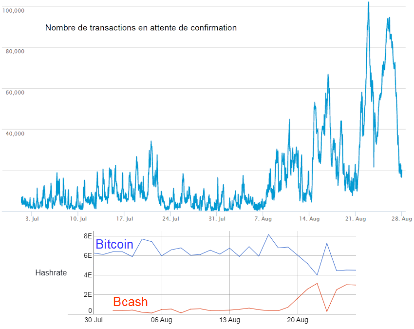Après des mois de juin et de juillet relativement stables, le nombre de transactions en attente de confirmation est reparti à la hausse depuis une vingtaine de jours. Comment expliquer cette tendance ? Intérêt croissant lié à la hausse du cours ? Perturbations passagères provoquées par l’arrivée de Bcash ? Manipulations de certains acteurs qui chercheraient à prouver que Bitcoin ne pourra pas s’en sortir sans un doublement de la taille des blocs ?