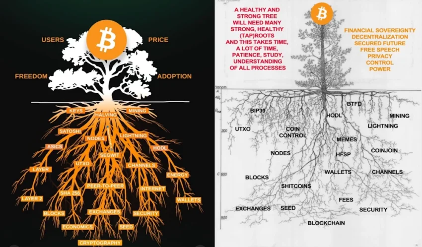 La série internet « Bitcoin and Friend » a déjà « individualisé » Bitcoin de manière anthropomorphique [5], Bitcoin a également été comparé à un ratel [6] mais justement il s’agit de personnifications et donc d’une vision « classique » de l’individualité. Par contre une vision plus proche de la théorie informationnelle de l’individualité compare Bitcoin à un champignon [7-9], dans cette vision chaque noeud, mineur ou autre entité lié à Bitcoin est un noeud du réseau de racines du champignon qu’est Bitcoin. Il y a également des memes comparant Bitcoin à un arbre :