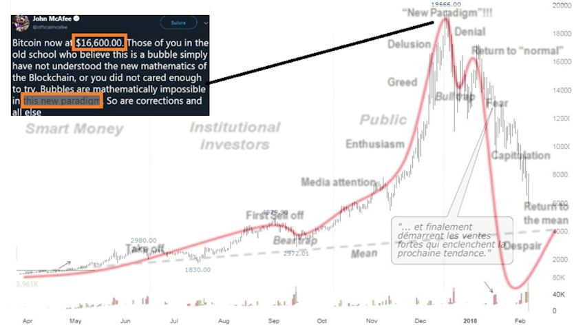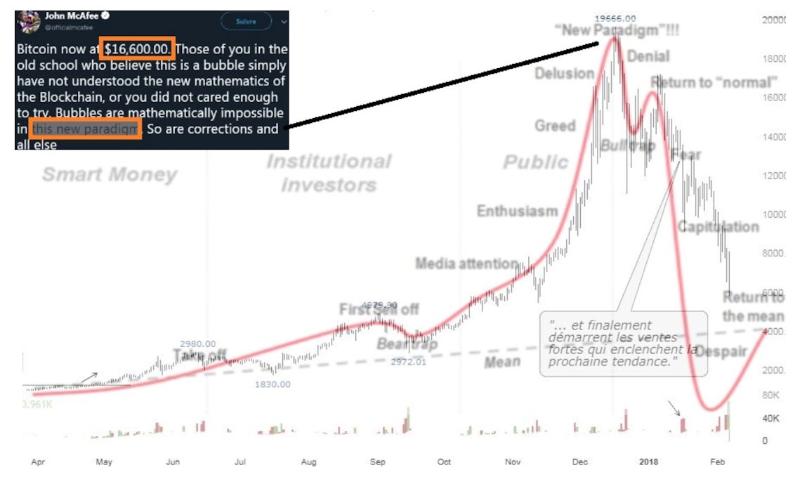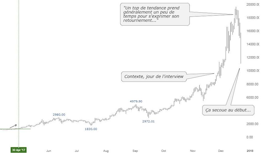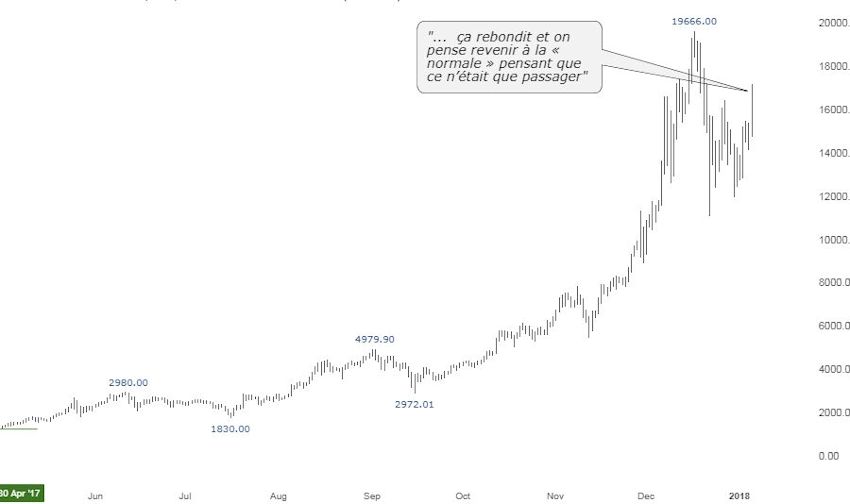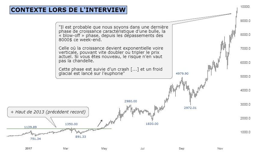 Découverte de prix, intérêt du chaland sans précédent, évolution quasi verticale à $8000 sur la fin d’un mouvement démarré à $200, nous avions là tous les ingrédients pour identifier que nous étions dans une dernière phase de bulle (“blow off”), bien que spectaculaire, l’opportunité financière était des plus faibles. C’est ce qui pouvait nous amener à lancer ce genre de recommandations, à contre-courant de l’agitation et de créations de contenus en masse sur le sujet.