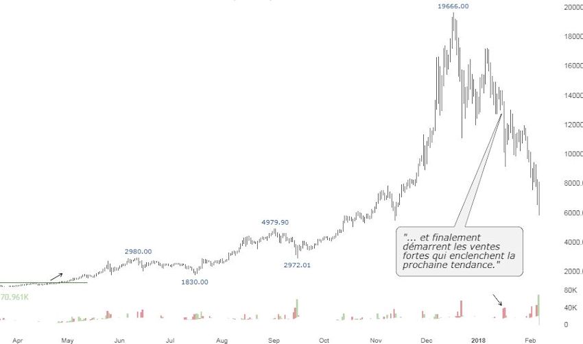 En effet, depuis 10 mois, le prix s’écrasait sur un support à +/- $6000, cette consolidation était très visible sur un graphique (voir ci-dessus). À ce moment là, deux scénarios se dessinaient :