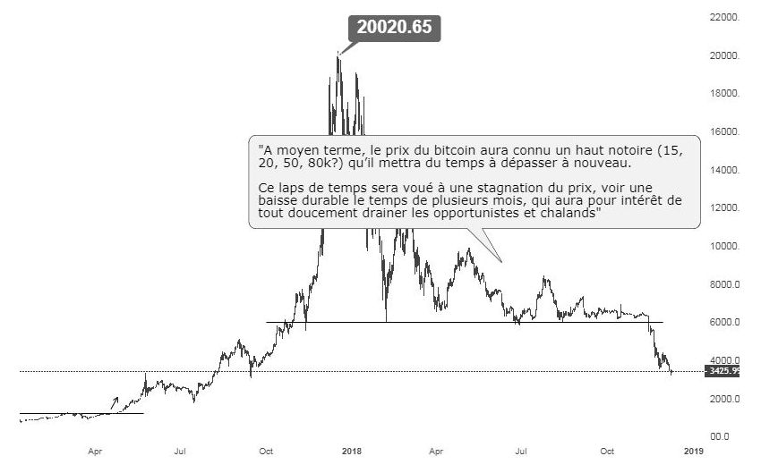 Premier point, analysons ce qui s’est passé au niveau du prix et de la valeur du Bitcoin. Rappelons que l’idée derrière la folle hausse de 2017 était que l’on franchissait un + haut de 4 ans (~$1300) ce qui ouvrait une phase de découverte de prix. L’idée était très simple et technique, nul besoin de chercher des explications alambiquées. Une droite horizontale au plus haut de Novembre 2013 et attendez que le prix passe au dessus. L’intérêt spéculatif faisant le reste.