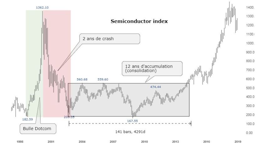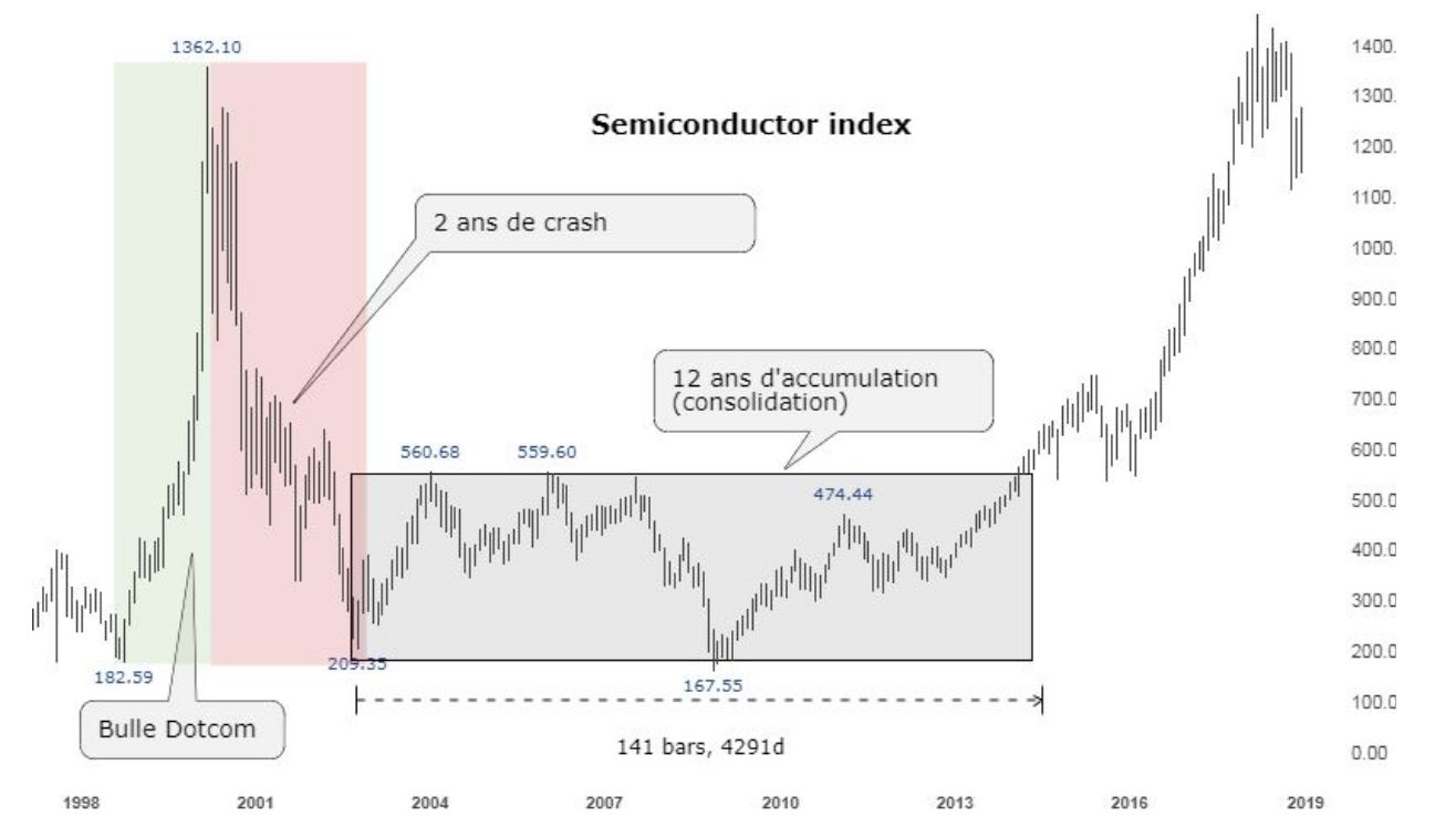 Je pense notamment à un parallèle qui s’est déjà produit sur des technologies d’avenir, prenons l’index des semi-conducteurs $SOX (ci-dessus).