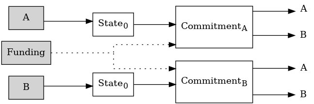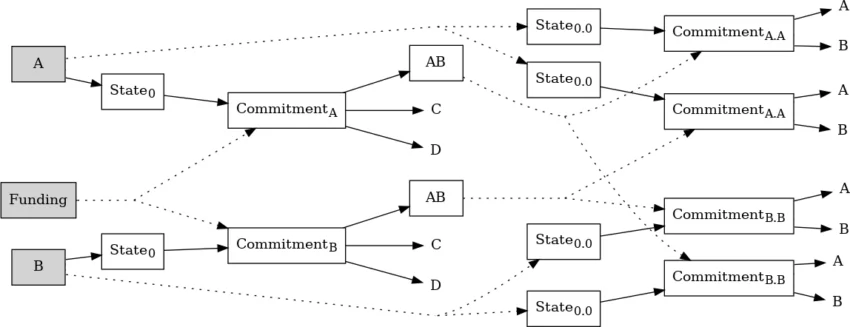 Dans le schéma ci-contre, les transactions confirmées sont grisées. Ils utilisent également chacun une sortie différente qu’ils contrôlent individuellement pour créer (mais pas diffuser) deux transactions d’état, une pour chacun d’entre eux. La première sortie de chaque transaction d’état paie un montant négligeable (disons 1 000 sat) en tant qu’entrée d’une transaction d’engagement hors chaîne verrouillée dans le temps. Le blocage temporel relatif empêche chaque transaction d’engagement d’être éligible pour une confirmation sur la chaîne jusqu’à un certain temps après que sa transaction d’état parente ait été confirmée sur la chaîne. Chacune des deux transactions d’engagement est également financée par des dépenses conflictuelles de la sortie de financement (ce qui signifie qu’une seule des transactions d’engagement peut finalement être confirmée). Une fois toutes les transactions enfants créées, la transaction qui crée la sortie de financement peut être signée et diffusée.