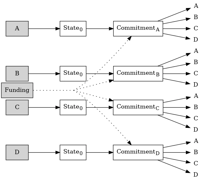 L’un des autres avantages du Tunable-Penalty Protocol (TPP) est que le montant de la pénalité est entièrement payé par l’utilisateur qui place sa transaction d’état obsolète sur la chaîne. Il n’utilise aucun des bitcoins de la transaction de financement partagée. Cela permet à plus de deux utilisateurs de partager en toute sécurité un canal TPP ; par exemple, nous pouvons imaginer qu’Alice, Bob, Carol et Dan partagent tous un canal. Chacun d’entre eux a sa propre transaction d’engagement financée par sa propre transaction d’état :