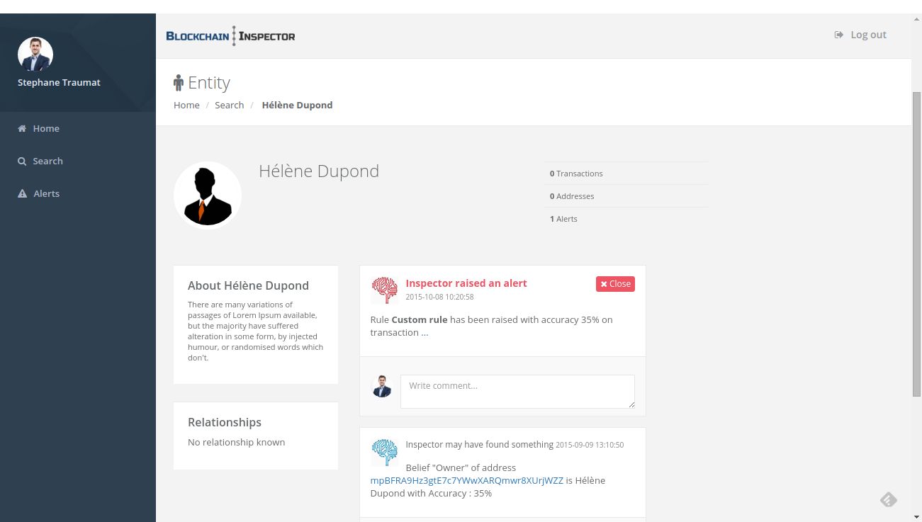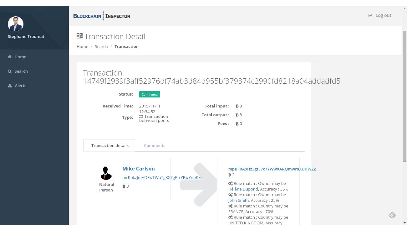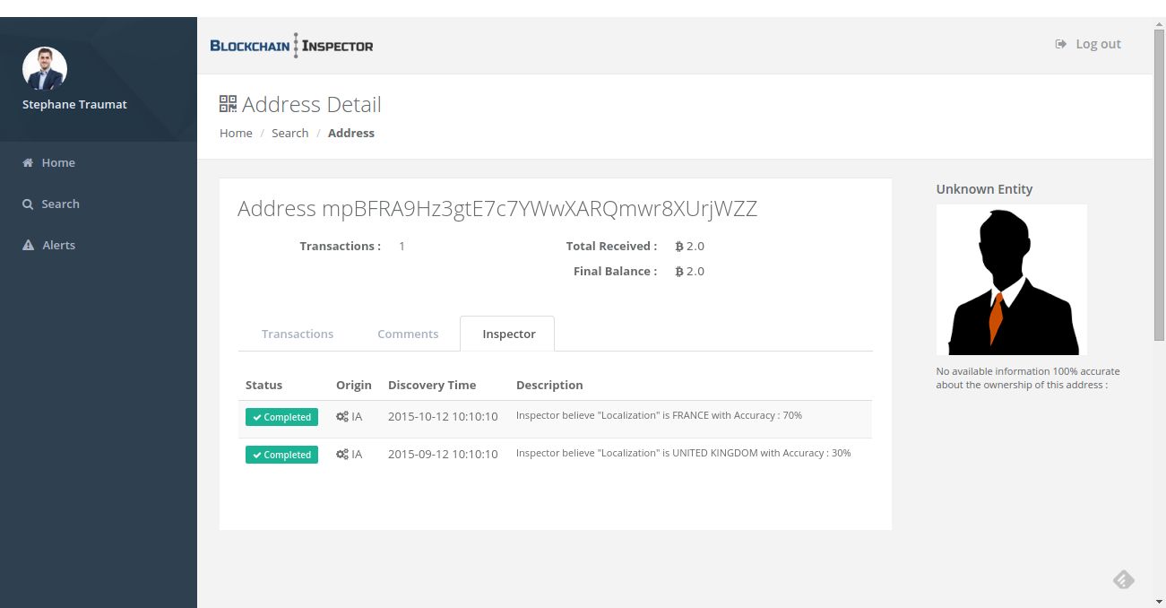 « Blockchain Inspector est un outil qui a pour objectif d’aider à combattre la fraude et le crime sur le blockchain. Grâce à notre outil d’intelligence artificielle (déjà utilisée dans de nombreux domaines notamment pour simuler le comportement des foules dans des parcs d’attractions ou pour le développement d’une voiture autonome), nos clients peuvent créer leurs propres règles afin de profiler les utilisateurs, suivre leur activité et lever des alertes en fonction de leurs comportements. L’avantage clé de notre solution est qu’elle permet d’intégrer des raisonnements humains et ainsi de transposer l’expérience des experts dans un système informatique capable de traiter des quantités de données très importantes.
