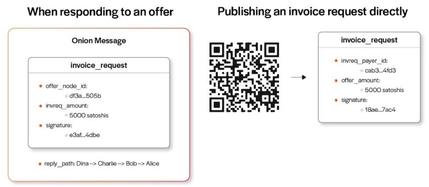 Avec le BOLT 12, l’utilisateur scannera une « offre » au lieu d’une facture. Les offres servent d’étape préliminaire au message de demande de facture. Les demandes de facture ont deux utilisations. La première est une réponse à une offre, contenant l’identifiant du propriétaire de l’offre et les détails de cette offre. Si la demande est valide, la réponse consiste à envoyer une facture en utilisant le chemin de réponse spécifié dans le message onion. L’autre cas d’utilisation consiste à publier directement une « invoice_request », à l’aide d’un QR code par exemple. Cette requête, une proposition d’envoi de fonds, contient l’identifiant du nœud qui paiera la facture.