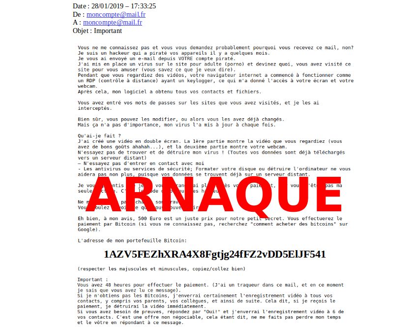 « Depuis plusieurs semaines, une campagne de diffusion massive de mails indiquant la récupération de vidéos suite au piratage de l’ordinateur des victimes et exigeant un paiement en bitcoin pour ne pas diffuser les vidéos récupérées a été constatée. Cette campagne est en réalité une escroquerie déguisée en chantage web cam. » – Source : internet-signalement.gouv.fr