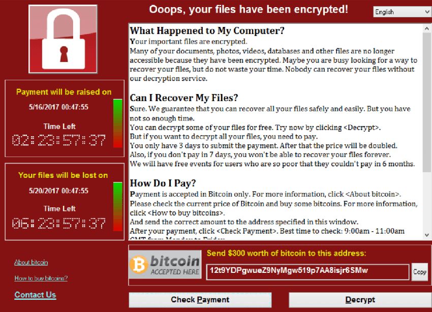 Sur tous les ordinateurs infectés mais également sur les panneaux d’affichage de certaines gares allemandes on a pu lire le même message d’erreur accompagné d’une demande de rançon de 300 dollars sous peine d’effacement des contenus, d’un logo Bitcoin et d’une adresse de paiement :