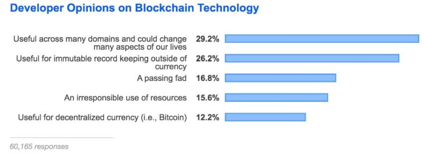 Selon le sondage de StackOverflow sur l’état du secteur du développement, 15% des développeurs estiment que le secteur des registres distribués correspond à « une gestion irresponsable de ressources » et 16% d’entre eux pensent que c’est « une mode passagère ». Cela signifie surtout qu’il y a encore beaucoup d’efforts de pédagogie à faire.