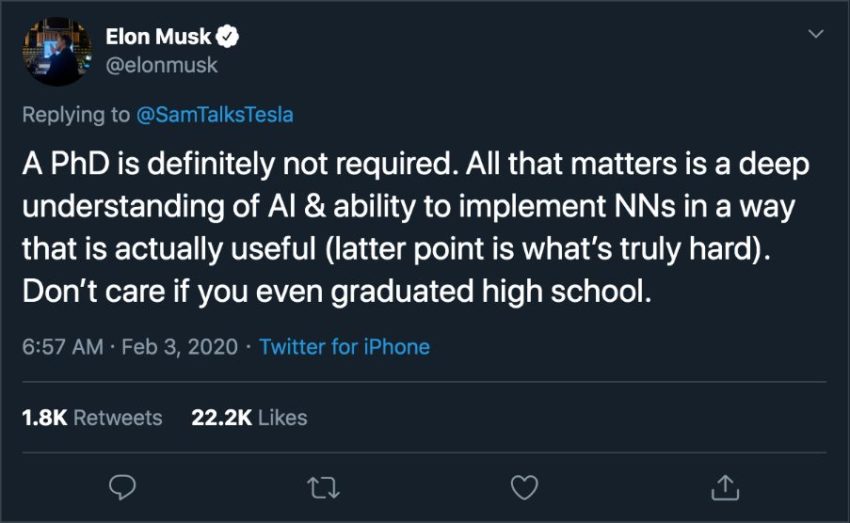 Cependant, le domaine du numérique casse de plus en plus les codes comme en atteste la dernière sortie en date du milliardaire, patron de Tesla et SpaceX, Elon Musk. Selon Elon, c’est votre expérience et vos projets persos ou professionnels qui peuvent faire toute la différence.