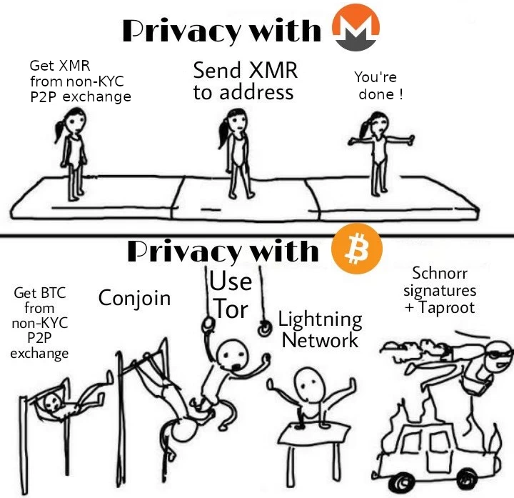 Dans la pratique il est possible d’anonymiser ses bitcoins mais c’est beaucoup plus complexe que sur Monero qui est anonyme par défaut, comme illustré sur ce meme :