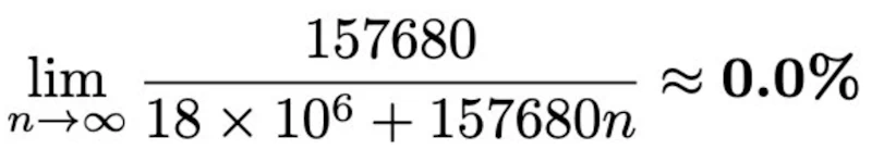 Monero a une inflation infinie dans le sens où il y aura une infinité de jetons Monero émis, or le poids de cette inflation tend vers 0. En effet, le poids marginal de l’inflation annuelle de Monero tend vers 0 comme l’illustre cette équation :