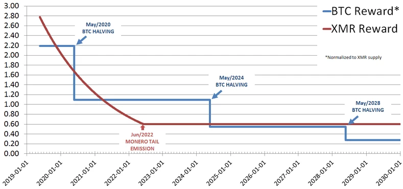 L’avantage de la politique d’émission de Monero comparé à Bitcoin est qu’il n’y a pas de rupture brutale de la vitesse d’émission et donc moins de capitulation de la part des mineurs, d’autant que les débats sur le « security budget » de Bitcoin (l’incitation des mineurs à continuer de miner si leur rentabilité baisse) sont inexistants dans la communauté Monero.