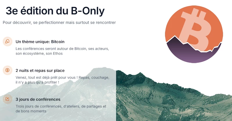 Organisée par l’association AlpineChain et Annecy Bitcoin, la 3e édition de la conférence B-Only aura lieu de 21 au 23 novembre 2025 à Annecy.