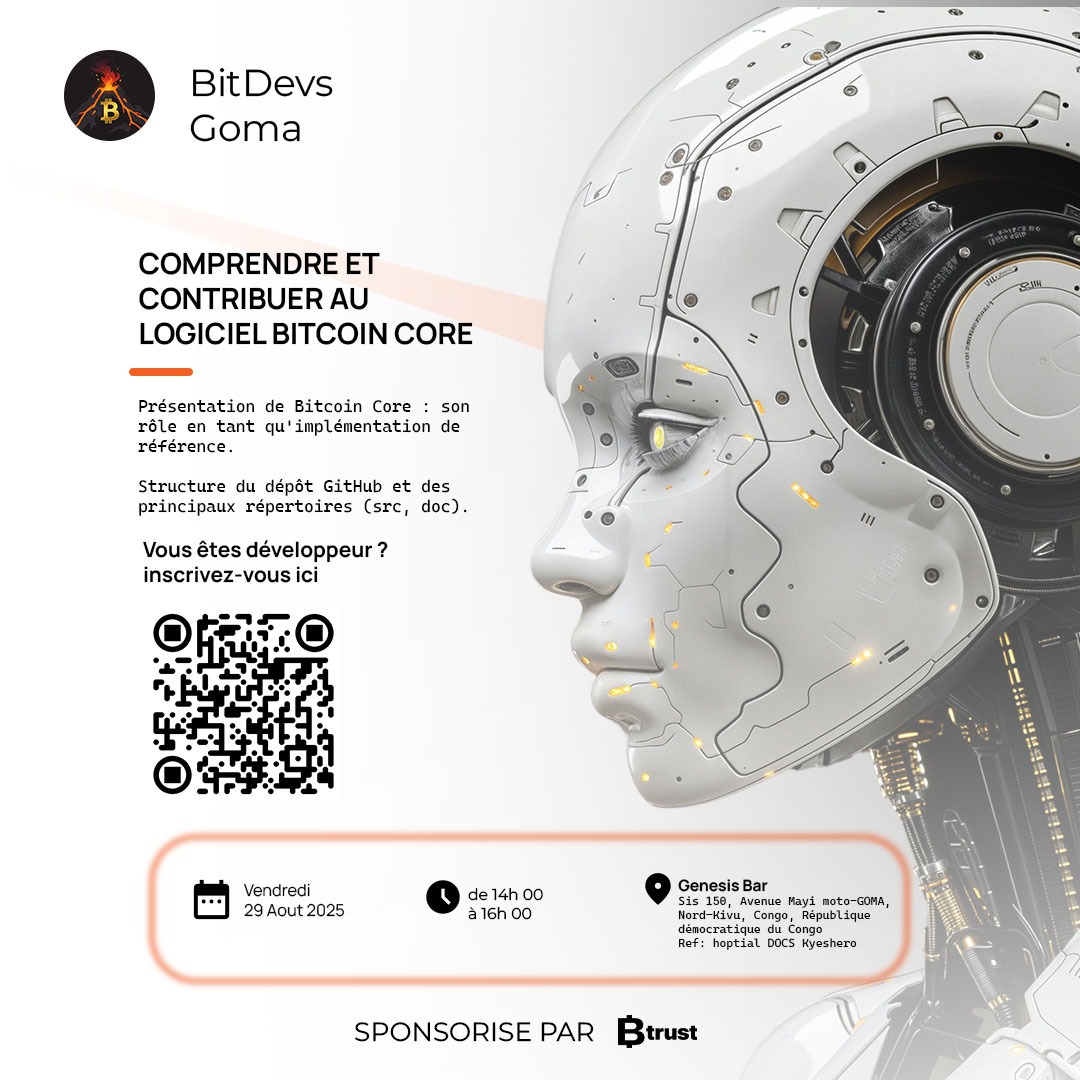 « BitDevs Goma est une communauté ouverte destinée à toutes les personnes passionnées par Bitcoin, la cryptographie, et les protocoles décentralisés. Elle vise à favoriser la recherche, l’apprentissage et le développement autour de Bitcoin à Goma (RDC), en rassemblant développeurs, chercheurs, entrepreneurs et curieux lors de rencontres régulières. Nos sessions sont l’occasion d’explorer en profondeur les aspects techniques de Bitcoin, de discuter des dernières évolutions dans l’écosystème, et de renforcer une culture locale de contribution au logiciel libre. »