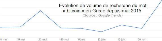 Il est probable cependant que cette hausse est sans doute davantage causée par la spéculation internationale face à la période trouble que traverse la zone euro que par des fuites massives de capitaux grecs. Néanmoins on a assisté ce week-end a une augmentation du nombre de recherches autour du mot « bitcoin » en Grèce :