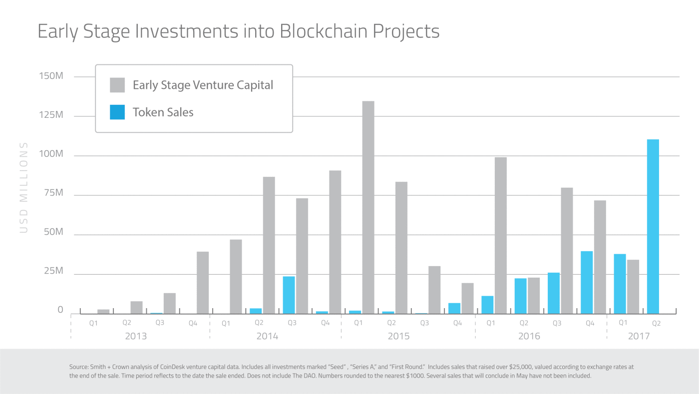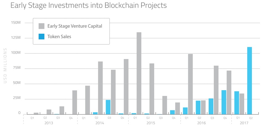 Graphique montrant l’évolution des sources financement des projets liés à la Blockchain (Venture Capitalist en gris / ICO en bleu) :