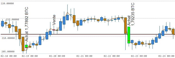 Mon expérience commence véritablement le 18 février 2015. Avec mes 366,34 €, j’achète, au prix du marché, 1,77892 BTC que je revends le lendemain pour 374,1226 €… la chance du débutant sans doute. Fort de mon succès, je place la totalité de mon pécule sur un ordre à seuil à 200 € le bitcoin. Mais le lendemain le cours grimpe à 215 €. Je revois donc mon ambition et finalement c’est un ordre limite à 208 € le bitcoin qui finira par passer le 22 février. Je précise que la plateforme que j’utilise prend 0,35 % sur chaque transaction, ce qui grève lourdement mes micro-bénéfices.