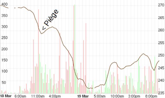 Suite de mes bourdes d’apprenti spéculateur : Après avoir vendu trop vite – à 216 euros – le 27 février dernier (pris dans le premier « bear trap » qui se dissimulait sur mon chemin), je jurais qu’on ne m’y reprendrait plus. Hélas, las de ronger mon frein et impressionné par la chute brutale de mercredi, me voilà les deux pieds dans le piège inverse : un faux signal haussier.