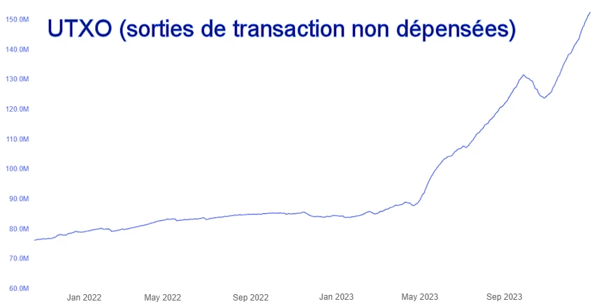 [3] Evolution du nombre d’UTXO et de la taille de la TimeChain Bitcoin :