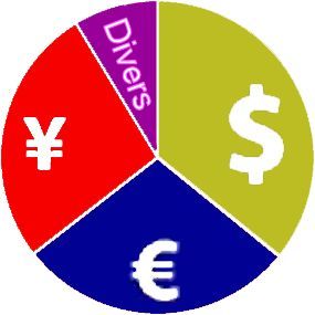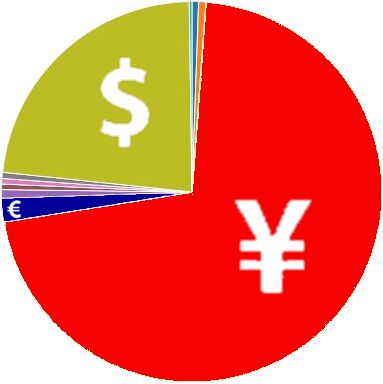 1. Yuans : 3 260 000 BTC (71,44%) 2. Dollars US : 1 050 000 BTC (23,09%) 3. Euros : 90 400 BTC (1,98%) 4. Livres sterling : 32 800 BTC (0,72%) 5. Dollars CA : 27 700 BTC (0,61%) |