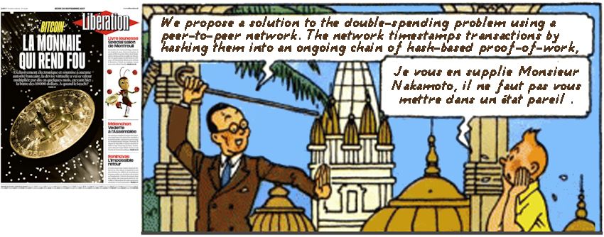 Bien sûr, le titre à la Tintin du Libération du jeudi 30 novembre : « la monnaie qui rend fou » devrait m’amuser, d’autant que la Une d’un grand quotidien national avec un cahier de 4 pages marque une sorte de consécration pour Bitcoin, que le contenu n’est pas foncièrement hostile et que je m’y vois gratifier de l’épithète de « figure parisienne des bitcoineux ».