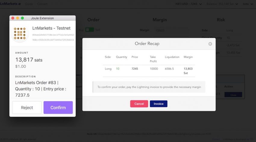 Après avoir ouvert et financé un channel lightning avec LnMarkets, les fonds du trader sont connectés à LnMarkets. Il a toujours la main dessus, mais il peut rentrer dans une position à tout moment. Quand un trader passe un ordre, il s’engage à transférer une margin (un dépôt de garantie) à LnMarkets. Le trader reçoit une facture lightning dont le paiement confirme le passage de l’ordre.