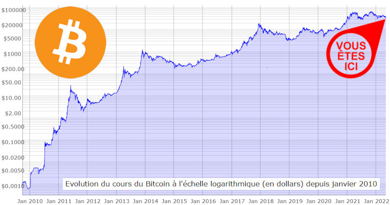 Evolution du cours du Bitcoin à l’échelle logarithmique (en dollars) depuis janvier 2010 :