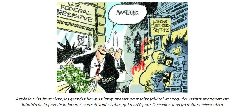 D’une part il existe toujours un risque de perdre sa mise – sauf bien sûr lorsqu’on est une grande banque « too big to fail » (trop grande pour faire faillite) et qu’on peut dire aux Etats derrière les banques centrales « si vous ne créez pas de l’argent pour nous le prêter, c’est l’économie toute entière qui s’effondrera avec nous ».