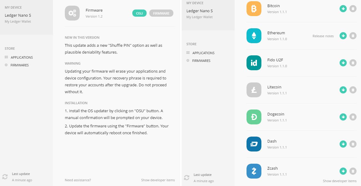 Pour mettre à jour le Nano S utilisez l’application « Ledger Manager » (disponible sur Chrome pour Windows, Mac OS, Linux ou Chrome OS), branchez l’appareil, entrez votre code PIN et, sur l’application chrome rendez-vous sur Firmwares > OSU (= OS update)