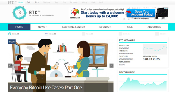 Si GAWMiners est un gros acteur dans la revente de matériel pour le minage de Bitcoin, la société avait cependant une idée complètement différente derrière la tête lorsqu’elle a acquis ce domaine. C’est seulement aujourd’hui que BTC.com a vu le jour. Sans grande surprise, il s’agit d’un portail esthétiquement réussi et généraliste sur le Bitcoin, où l’on peut trouver les dernières actualités, prix et les bases sur la devise électroniques (en anglais).