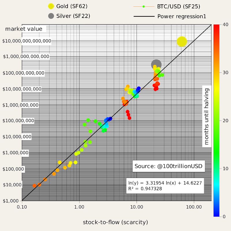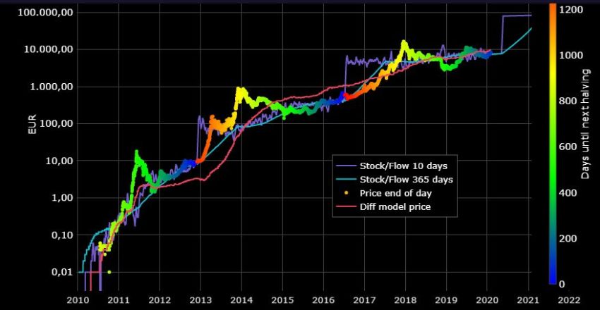 Mais comment ce modèle pourrait-il s’appliquer au bitcoin pour prédire l’évolution de son prix ? Contrairement à d’autres « commodités », la quantité exacte de bitcoins est connue et le rythme de production à venir peut être estimé avec une grande précision. Son ratio « stock sur flow » est multiplié par deux tous les 210 000 blocs, soit tous les quatre ans environ, sachant qu’un bloc est créé toutes les 10 minutes en moyenne. Si on compare l’évolution depuis 2009 de son ratio « stock sur flow » et celle de sa valeur en euros, on constate en effet une relation statistiquement significative… jusqu’à aujourd’hui :