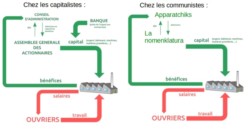 Ci-dessous un schéma des structures de pouvoir de la production rationalisé chez les capitalistes et chez les communistes :
