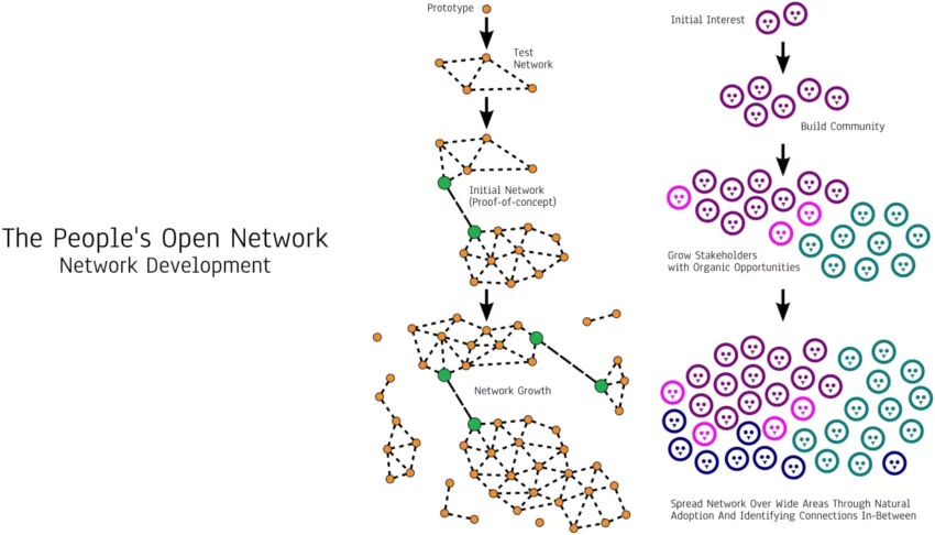 Contrairement au mode d’organisation présenté précédemment, les réseaux distribués sont très difficilement nationalisables. L’on pourrait rétorquer que ce réseau n’est qu’une somme de petites pyramides hiérarchiques et qu’il suffirait de faire la somme de celles-ci, c’est d’ailleurs le cas pour le secteur de la viticulture. Or dans la pratique c’est plus complexe, car c’est un réseau de pyramides hiérarchiques dont la quantité de matières premières, le coût de fonctionnement, la taille de structure (et même l’existence ou pas) varie en fonction du temps et très rapidement. Il faudrait « sonder » (ou « échantillonner » ) le réseau presque en permanence. Ci-dessous un schéma du développement en plusieurs étapes d’un réseau distribué :