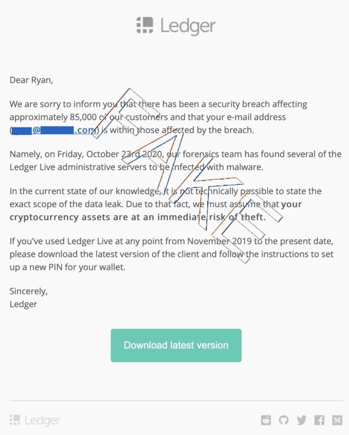Exploitant les données qui avaient fuité en juillet dernier, une invitation personnalisée a été envoyée à certains clients de Ledger. Présentée une alerte de sécurité, le message demande de télécharger une mise à jour de Ledger Live pour se prémunir d’un malware. Ne téléchargez pas ce programme. Il s’agit bien évidemment d’une attaque de phishing qui vise directement vos 24 mots de récupération.