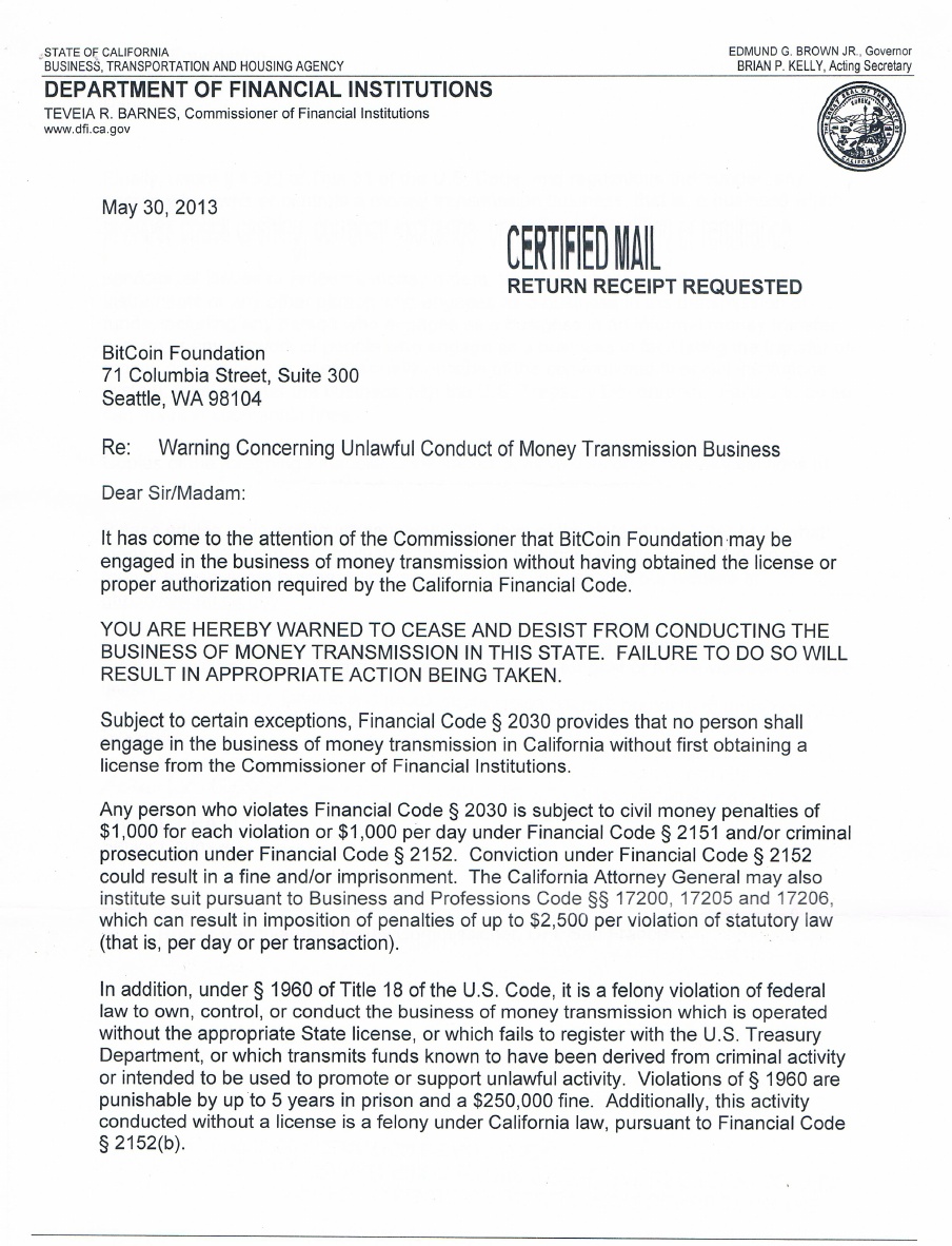 Jon Matonis, de la Bitcoin Foundation, vient de révéler dans Forbes une lettre d’ordonnance de cessation et d’interdiction envoyée par l’Etat de Californie à la fondation qui est accusée d’effectuer du commerce monétaire sans licence ou autorisation officielle. Le problème c’est que la fondation n’est pas une place de change et qu’elle ne gère aucune transaction : Bitcoin est entièrement décentralisé.