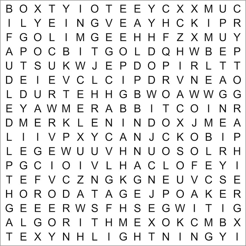 2. Trouvez les seize mots en relation avec Bitcoin (et de 6 lettres au minimum) contenus dans cette grille :