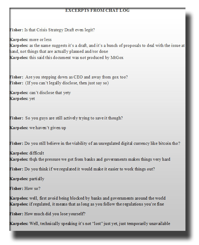 Dans une conversation en ligne avec Jon Fisher publiée par foxbusiness.com, Mark Karpeles affirme qu’il n’a pas encore renoncé à son poste de CEO et que le document mis en ligne sur scribd.com n’émane pas de MtGox et que les pressions exercés par les banques et les gouvernements rendent les choses difficiles [pour les plateformes de change].
