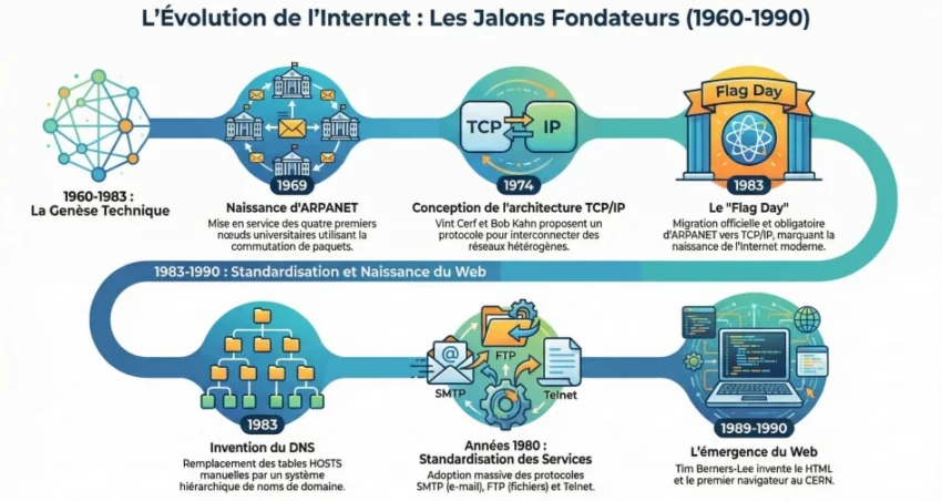 Des premières recherches sur la commutation de paquets et ARPANET dans les années 1960 sont nées les architectures et protocoles fondamentaux (NCP → TCP/IP) des années 1970–1980, jusqu’aux fondations techniques de l’Internet public des années 1990 [1] :