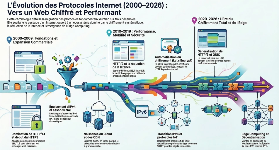 C’est à partir de la fin des années 1990 et au début des années 2000 qu’internet se massifie et se commercialise, ce qui était autrefois une affaire de militaire ou d’universitaire devient grand public, le format HTTPS commence à être adopté, les emails se généralisent et les commerçants commencent à avoir leur page internet. Les années 2000 à 2010 sont celles de l’émergence des réseaux sociaux (Twitter, Facebook…) et des services de cloud. C‘est à la fin des années 2010 que la quantité maximale d’adresse IPv4 (adresse IP servant à identifier un site) est presque atteinte, heureusement le protocole IPv6 prend progressivement le relais. Des années 2010 à 2020 les débits internet s’améliorent notamment grâce à la généralisation de la fibre optique, le format HTTPS (une version chiffrée de HTTP) devient majoritaire et l’IoT (montres connectées, réfrigérateurs connectés…) commence à apparaître. Enfin, des années 2020 à 2026 le format de transport de données UDP est de plus en plus utilisé notamment pour le streaming, les noms de domaines « .ETH » de la blockchain Ethereum fusionnent avec l’internet « classique » [3] dans le sens où il existe des pages internet dont le nom de domaines est stocké sur la blockchain Ethereum, la révolution IA (notamment les LLM) devient grand public.