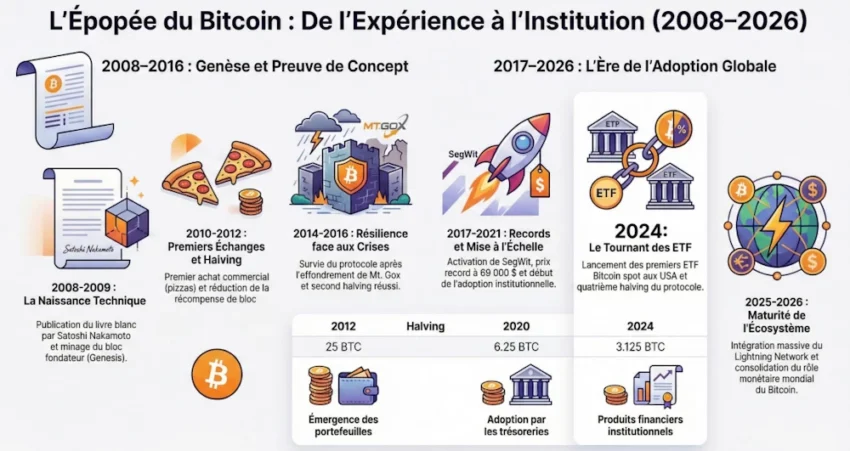 Ci-dessous une frise chronologique de l’histoire de Bitcoin de 2008 à 2026 :