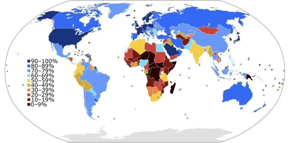 Pourcentage rapporté à la population par pays du nombre d’utilisateurs internet en 2023 [5] :