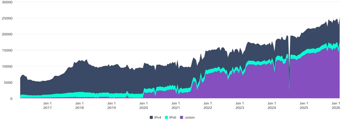 Ci-dessous l’évolution du nombre de nœuds publics Bitcoin de 2017 à 2026 [10] :