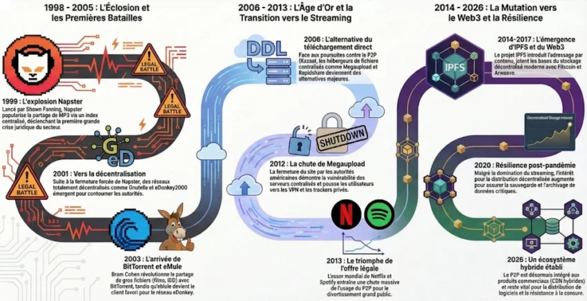 Ci-dessous une frise chronologique résumant les grands temps forts du partage de fichiers P2P :